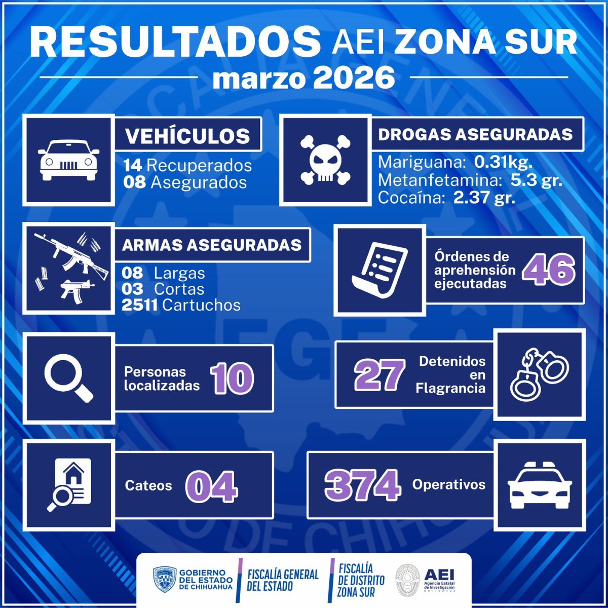 La Agencia Estatal de Investigación (AEI) adscrita a la Fiscalía de Distrito Zona Sur, dio a conocer los resultados obtenidos durante el mes de marzo, derivados de las acciones permanentes en materia de investigación, prevención y combate a la delincuencia en la región.
