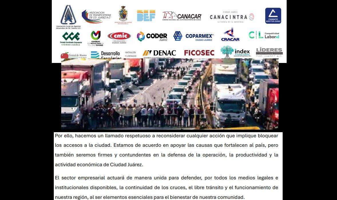 Las organizaciones empresariales de Ciudad Juárez queremos compartir de manera clara y respetuosa nuestra postura ante la posibilidad de bloqueos en los cruces fronterizos y carreteras por parte de grupos de agricultores y algunas agrupaciones de transportistas.