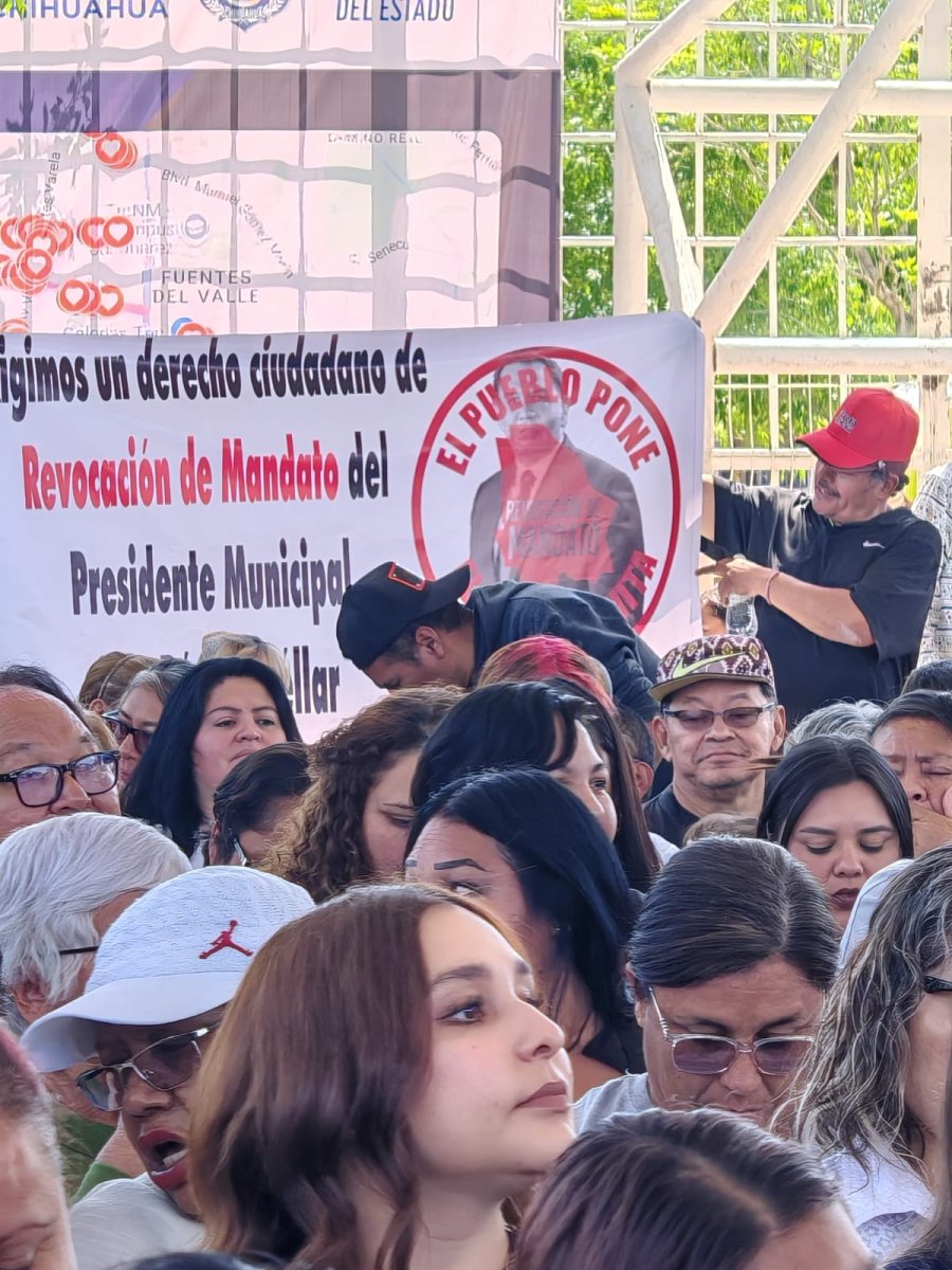 Esto se dio mientras el secretario de seguridad Gilberto Loya se encontraba dando unas palabras, entre las que mencionó que Juárez es la casa de la gobernadora Campos, cuando las personas se plantaron al fondo del evento con una pancarta con la leyenda “ Exigimos el derecho ciudadano de revocación de mandato del Presidente Municipal, Cruz Pérez Cuéllar. El pueblo pone, el pueblo quita”.