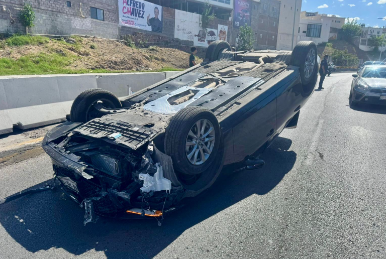Una aparatosa volcadura se registró sobre la avenida La Cantera, en sentido de oeste a este, justo en la conocida “curva de los choques”, antes de ascender el puente que cruza la avenida Washington.
