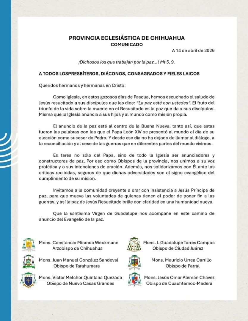 La Provincia Eclesiástica de Chihuahua, respaldó al Papa León XIV tras las fuertes críticas del presidente Donald Trump por pedir el alto a la guerra en el Medio Oriente y tras calificar a militares de Irán e Israel de violencia injustificada.