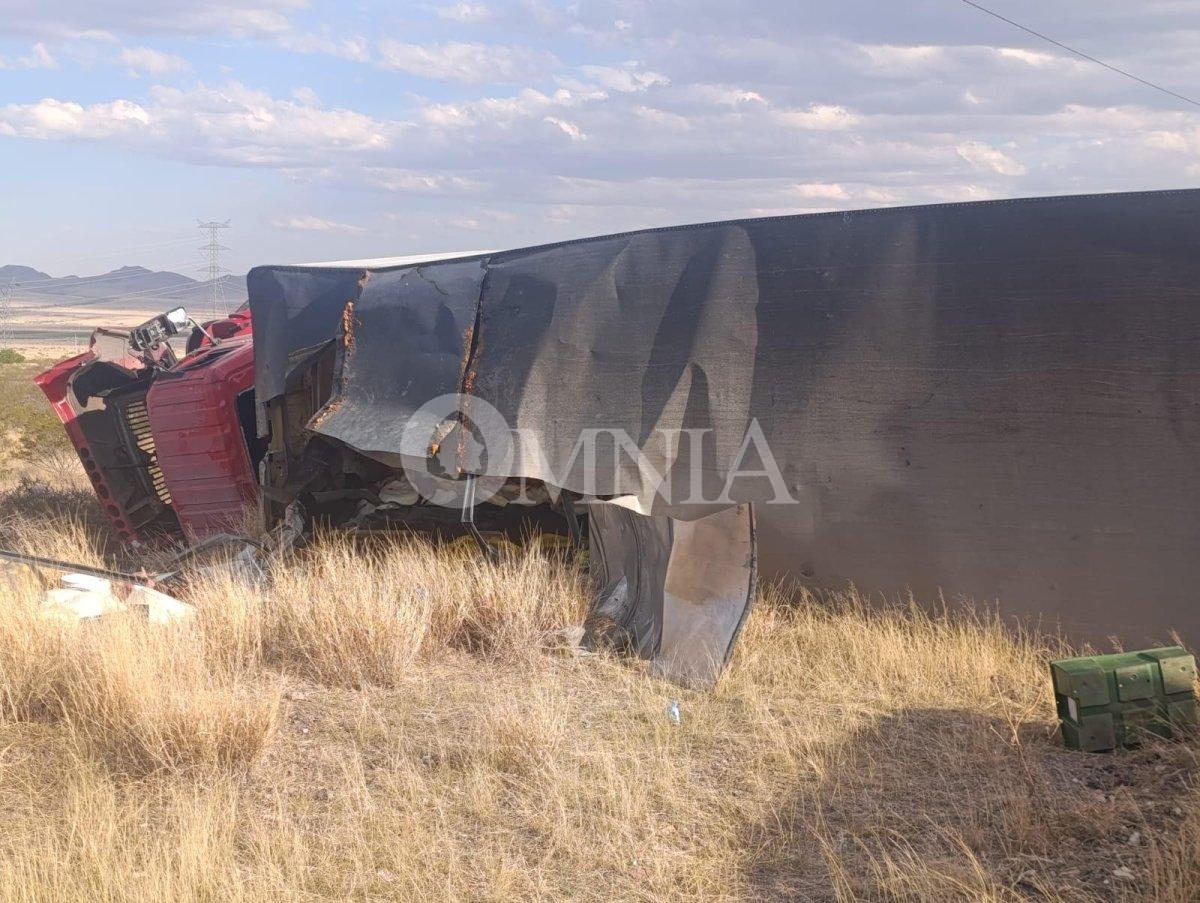 Una volcadura de tráiler registrada a la altura del kilómetro 126 de la carretera Chihuahua–Juárez dejó como saldo dos personas lesionadas y un hombre sin vida.