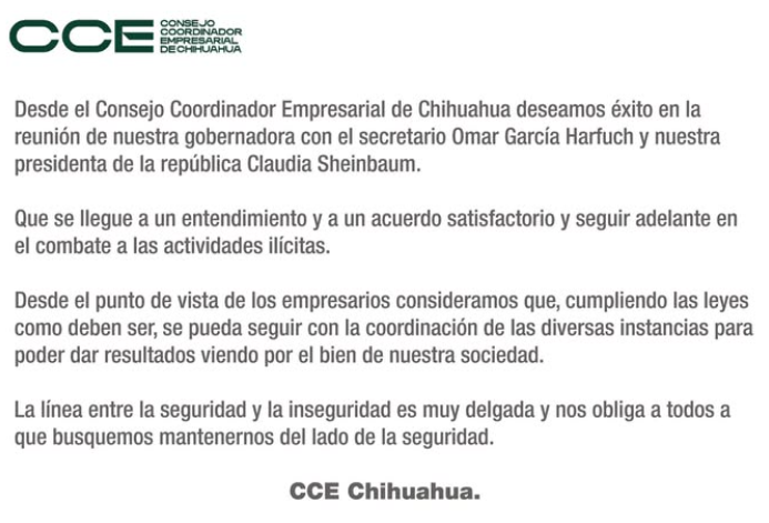 El presidente del Consejo Coordinador Empresarial (CCE) en Chihuahua, Leopoldo Mares, expresó su respaldo y buenos deseos ante la próxima reunión entre la gobernadora del estado, el secretario de Seguridad, Omar García Harfuch, y la presidenta de la República, Claudia Sheinbaum.
