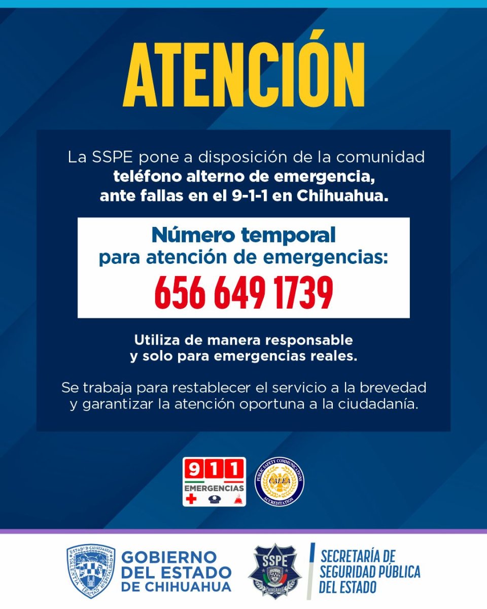 La Secretaría de Seguridad Pública del Estado (SSPE), encabezada por el secretario Gilberto Loya, informa a la ciudadanía que, derivado de fallas en la línea telefónica del sistema de emergencias 9-1-1 en la ciudad de Chihuahua, se ha habilitado un número