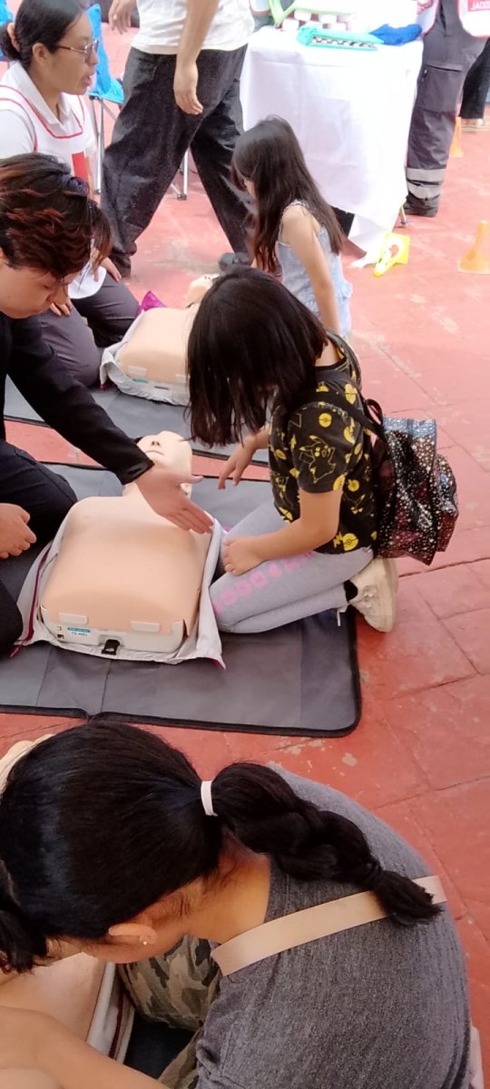La mañana de este día, la Cruz Roja llevó a cabo un evento enfocado en la capacitación en primeros auxilios, en la explanada del Palomar donde niñas participaron activamente en el aprendizaje de técnicas de reanimación cardiopulmonar (RCP) en adultos.
