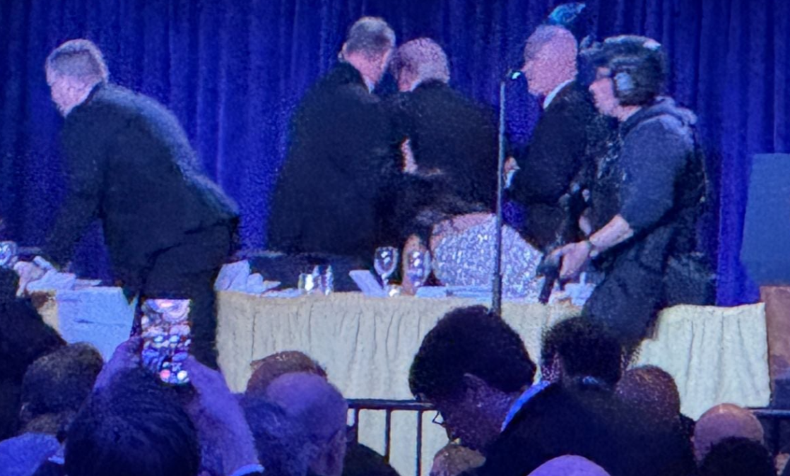 Después de que se efectuaron disparos el sábado, agentes del Servicio Secreto rodearon a Trump, quien pareció resbalar ligeramente mientras lo retiraban a toda prisa. Otro equipo movió a Vance tan rápido que parecía que podría sacarlo incluso mientras aún estaba sentado en una silla de banquete.