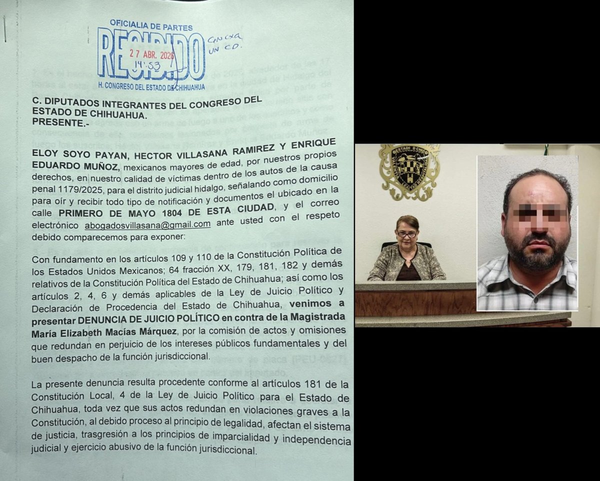 El empresario Eloy Soyo Payan así como los abogados Héctor Villasana Ramírez y Enrique Eduardo Muñoz, presentaron solicitud de juicio político ante el Congreso del Estado en contra de la Magistrada María Elizabeth Macías Márquez.