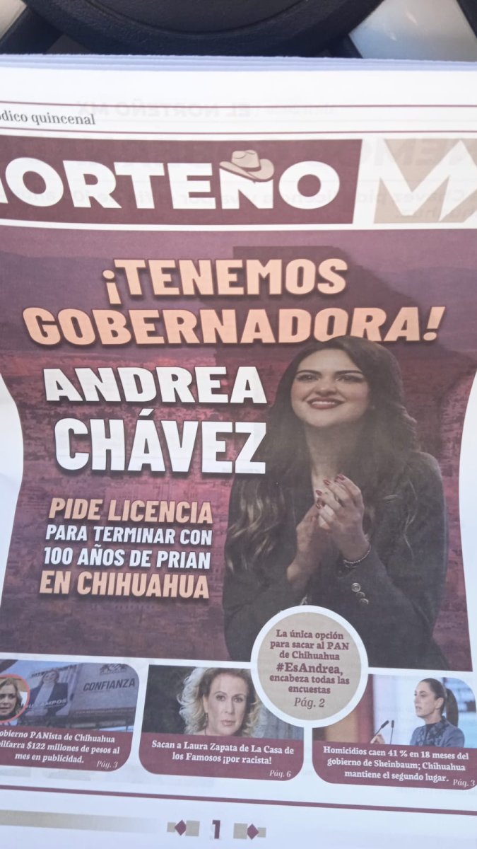 Y este lunes no fue la excepción, pues llamó la atención que en algunos cruceros de la ciudad se repartió el medio “Norteño MX”, el cual promociona la imagen de la morenista Andrea Chávez, en donde se destaca su licencia para contender por la gubernatura.
